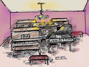 There were four pianos in the living room — three uprights and a baby grand. The convert said he fixed pianos for a living. About a month after the knife-chase, he came back for the pianos, with a police escort. I think he was charged with domestic violence. Maybe there was a restraining order, too.